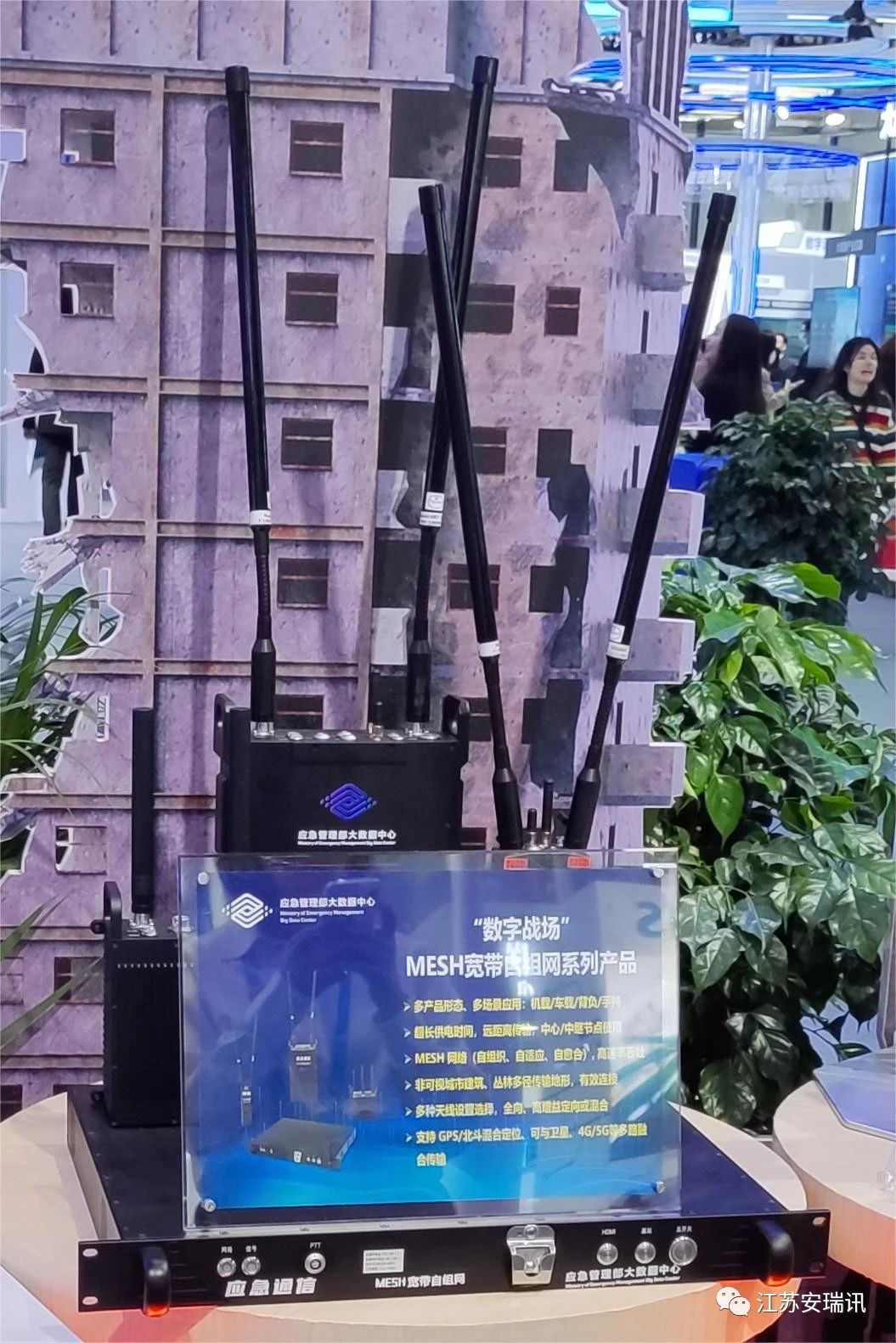 江苏安瑞讯携多款“数字战场”MESH宽带自组网系列产品参展,展示了具有国内领先的MN-MIMO (多输入多输出) 、MANET (移动自组织网络)等MESH宽带自组网通信技术。公司将持续秉承“共创、共享、共赢”的理念,坚持以“守正明道、初心致远、同舟共济”的企业价值观,为国家应急事业添砖加瓦!